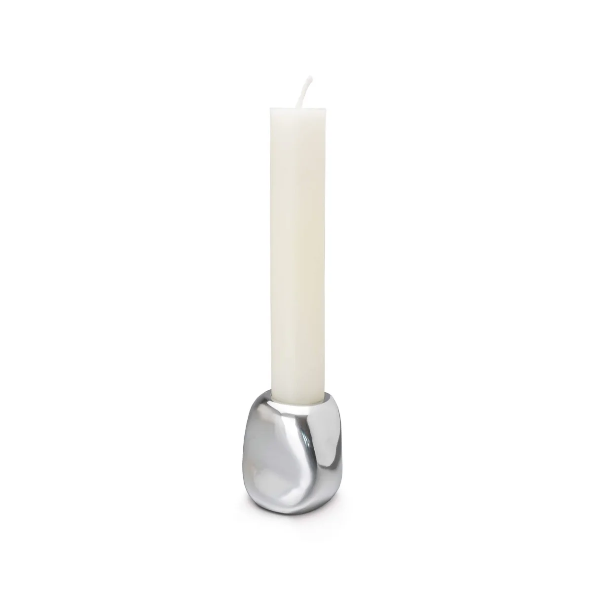 The perfect complement to our glass and pottery, add another element to the table with this exclusive cast-metal candlestick holder. Our design takes inspiration from smooth riverstones, featuring a high-polish finish that adds shine and brilliance to any setting.