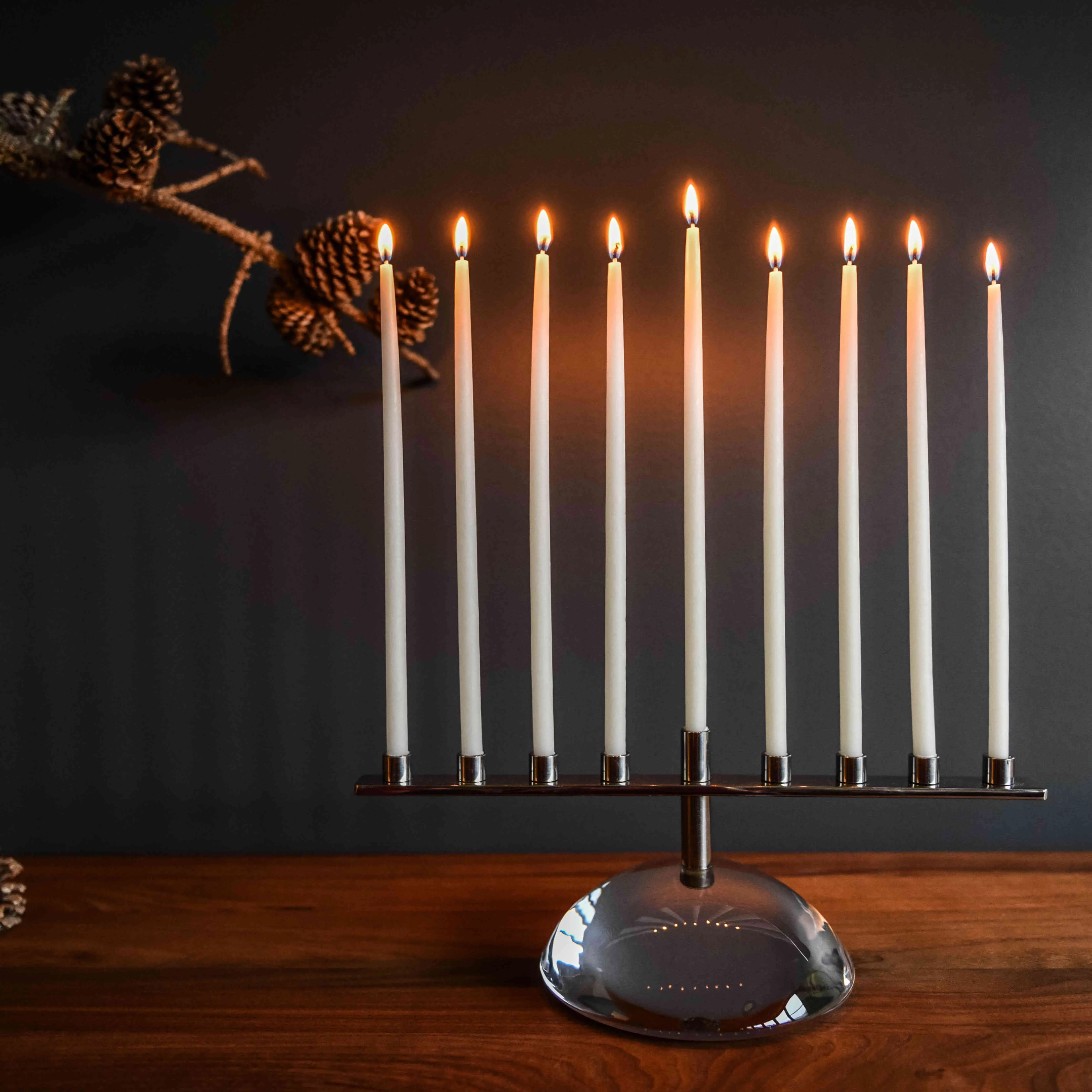 Celebrate the festival of lights with a nature-inspired handmade Menorah. The rushing waters of our home state’s rivers, brooks and streams create smooth, flattened riverstones that inspire the shape of the handmade glass base – which is polished to reflect flickering candlelight.
